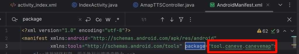 打开Android 应用工程的”AndroidManifest.xml“配置文件,package属性所对应的内容为应用包名。